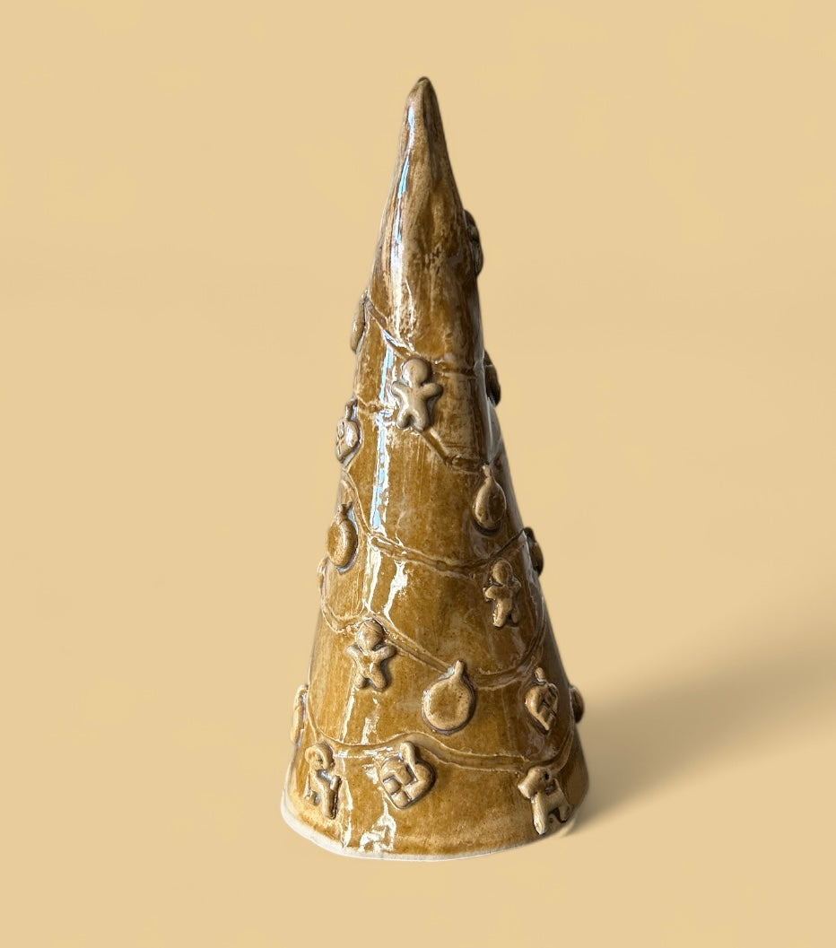 Dette håndlavede juletræ i keramik er 16 cm højt og skabt med kærlig hånd i et unikt design. Træet har en smuk, blank glasur i varme gyldne toner og er dekoreret med små fine julemotiver som hjerter, stjerner, nisser og julekugler, der slynger sig hele vejen rundt som en kæde.