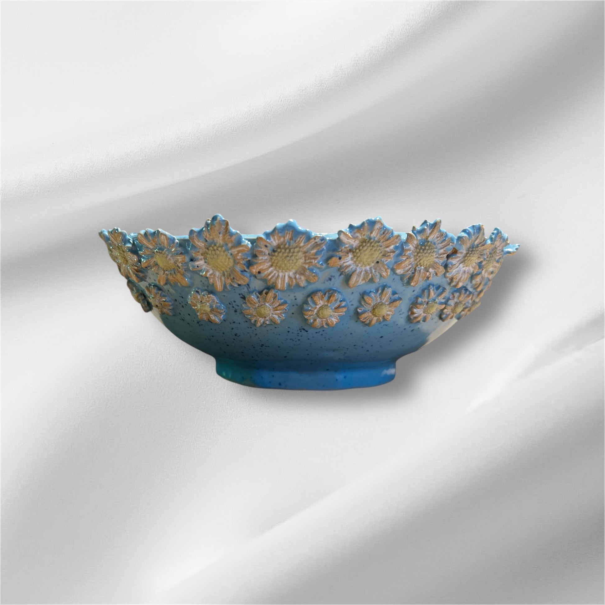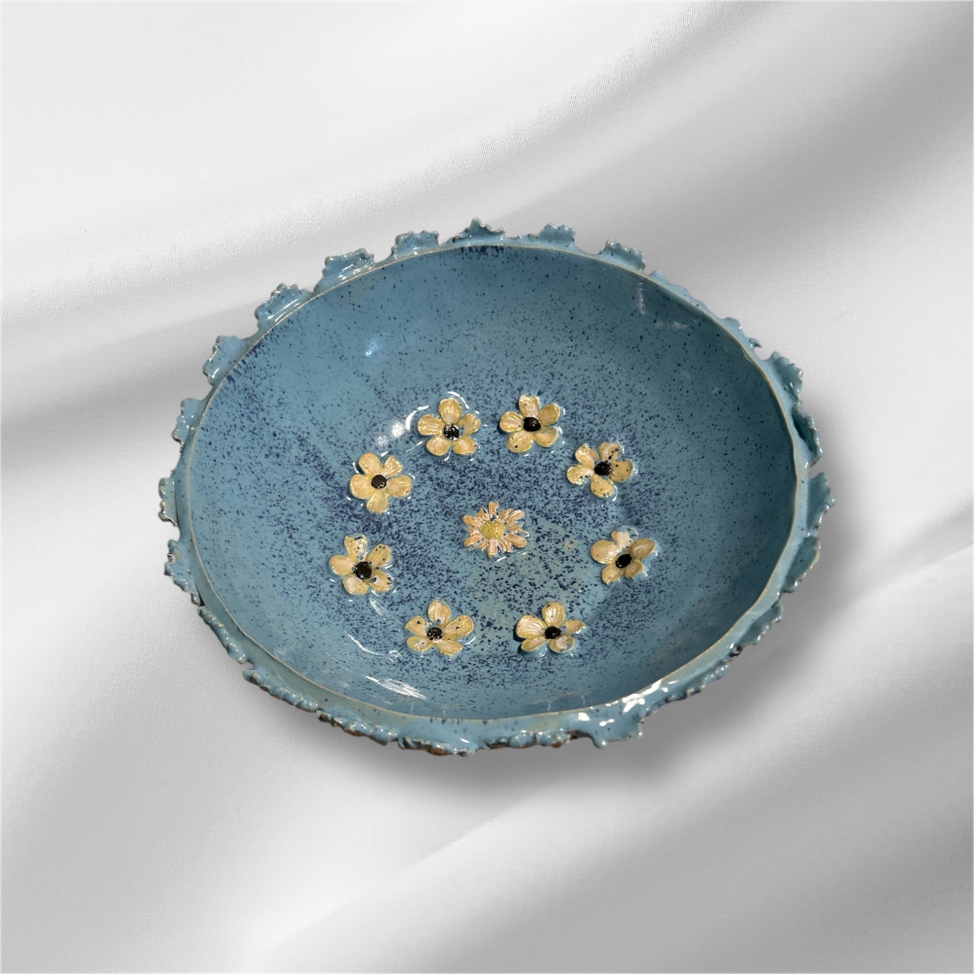 Skålen er glaseret i en dyb, himmelblå farve og dekoreret med fine blomster i lyse nuancer, som giver et romantisk og livligt udtryk. Hver blomst er formet og sat på i hånden – ingen to skåle er ens.
