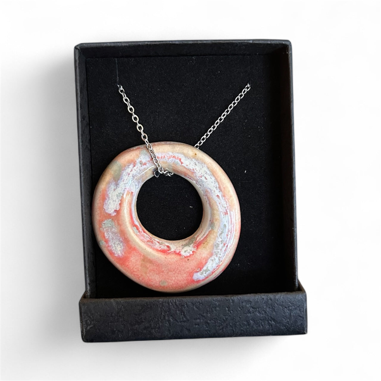 Det organiske, runde vedhæng er glaseret i blide rosa grå og beige nuancer og hænger i en enkel sølvfarvet kæde.