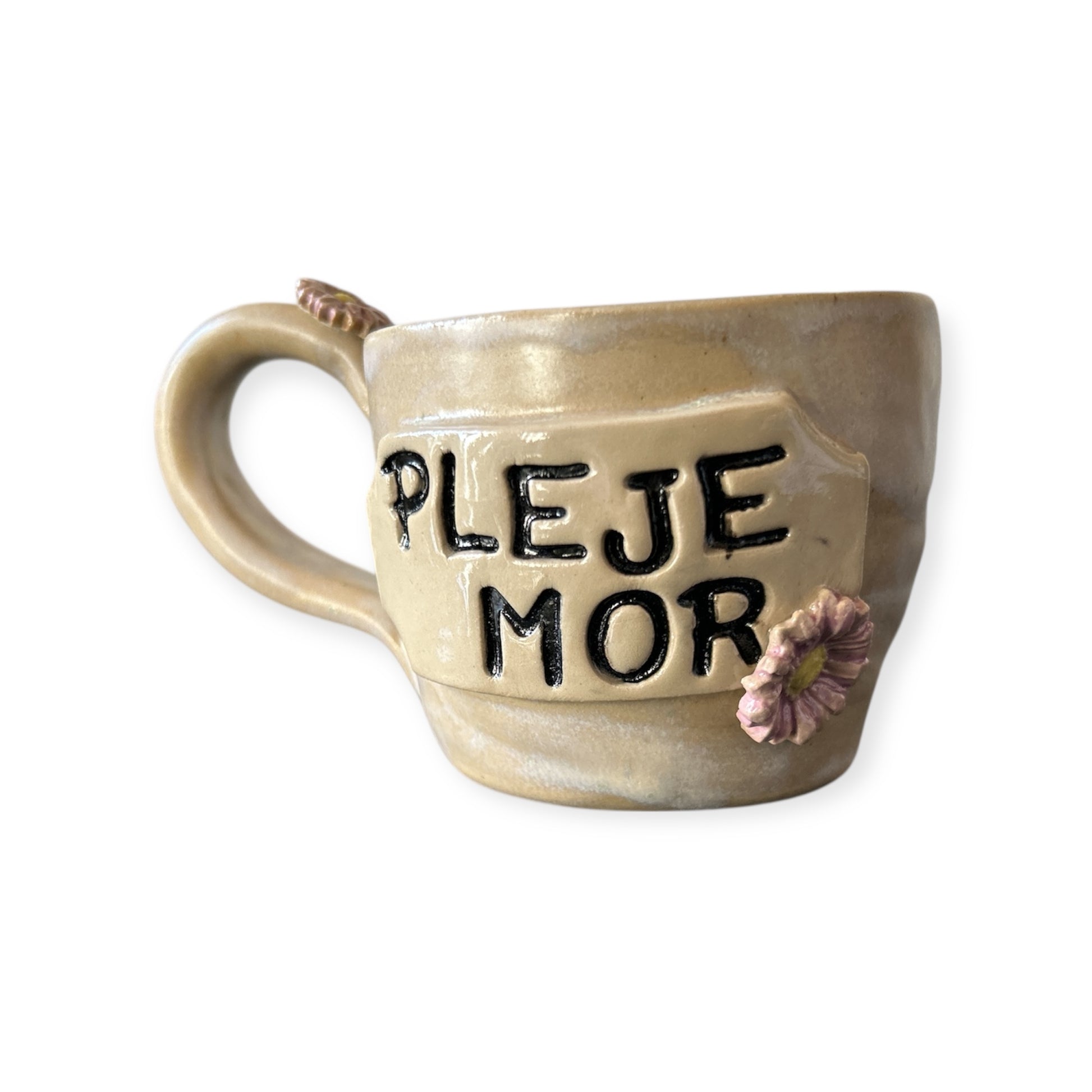 ✨ Dekoreret med blomster og teksten “PLEJEMOR” i sort relief