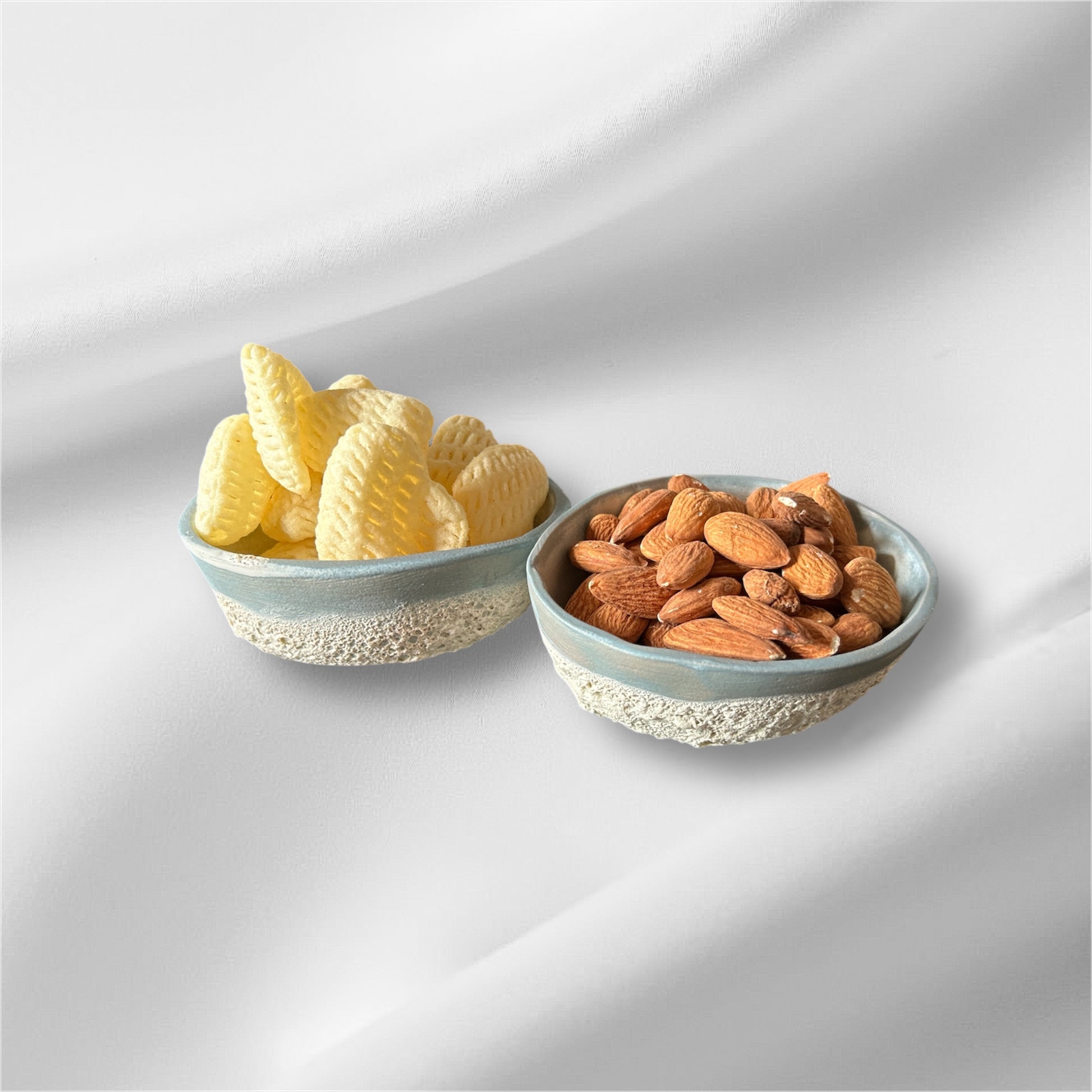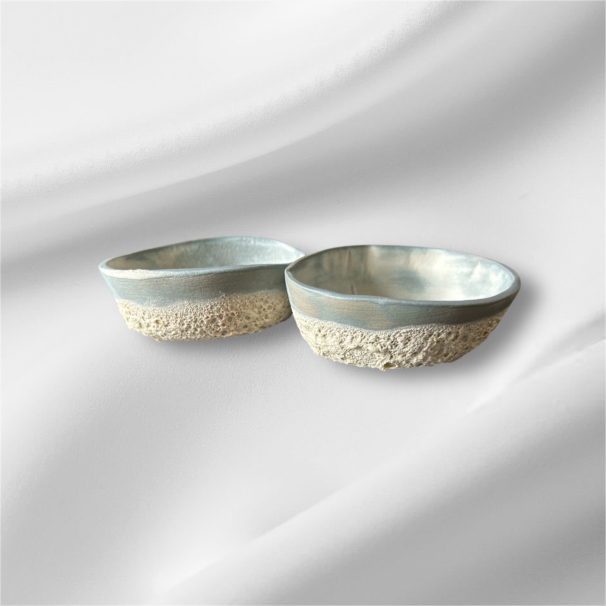 Sæt med små 2 skåle. Lavet i stentøj. Glaseret med en mat blå glasur med farvespil , i bunden glaseret med en smuk lava glasur . Perfekt til snacks snacks medfølger ikke