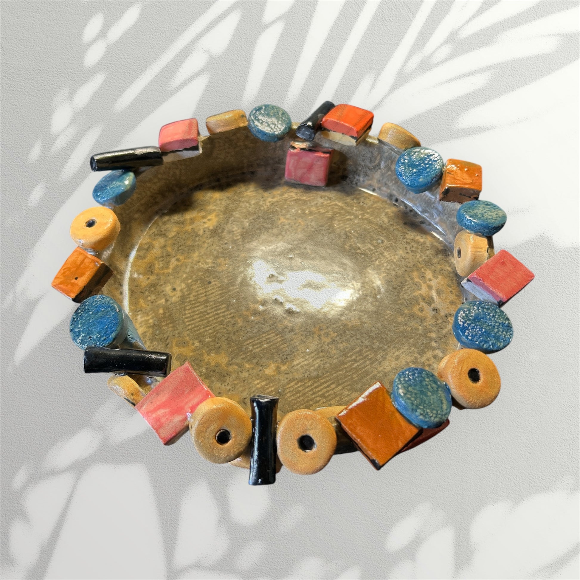 Et unikt håndlavet stentøjsfad med en blank, grå glasur med neuancer i midten og en sjov, farverig kant inspireret af klassisk lakridskonfekt.