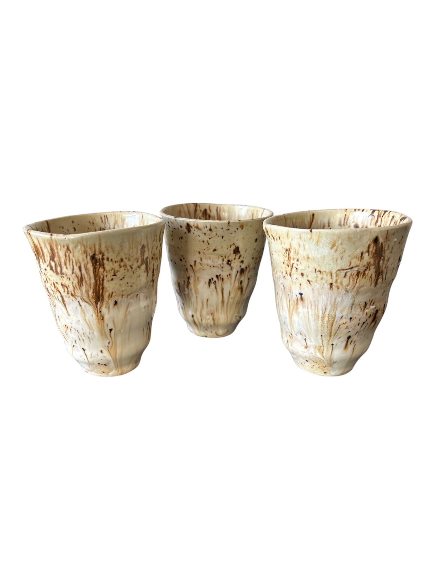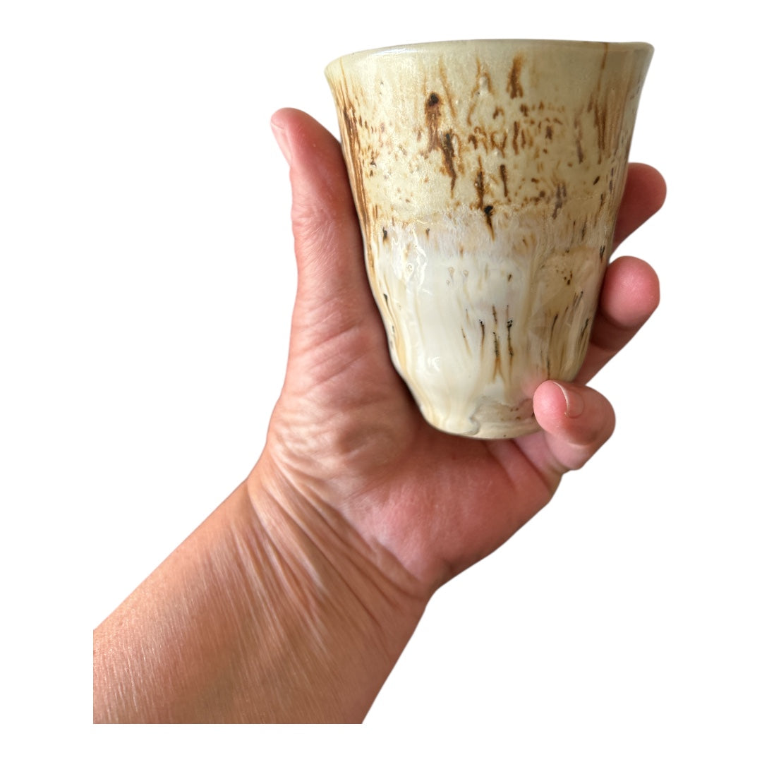 Disse smukke keramikkrus er støbt i en form, jeg selv har designet og lavet, hvilket gør hver enkelt kop helt særlig. Med deres organiske form og varme, løbende glasur i brune og cremefarvede nuancer, får du et krus med masser af karakter og sjæl.